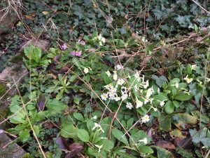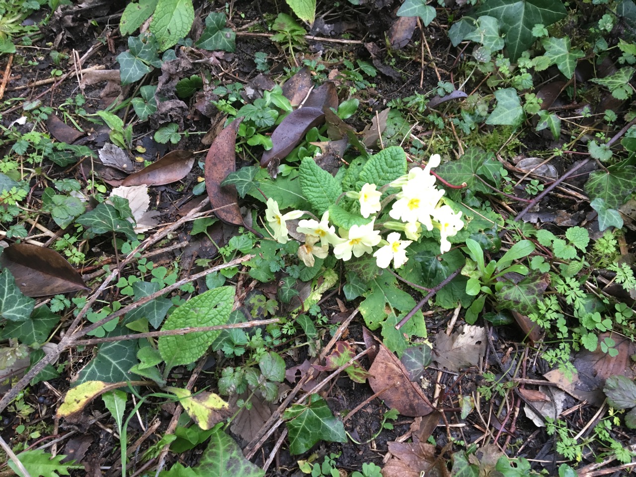 Det är mer blommor i trädgården. I gången ned mot grannen blommar det rätt mycket gult och lite lila. Tror några av dessa har planterats om av L men sedan spridit sig ut på själva ”stigen” också.