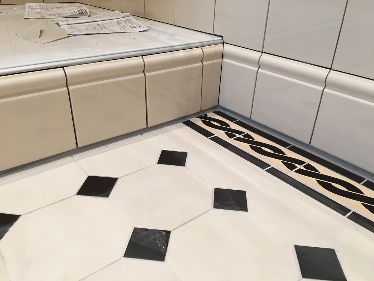 Kaklade sista bitarna på sockeln. Fogat mellan golv och vägg.