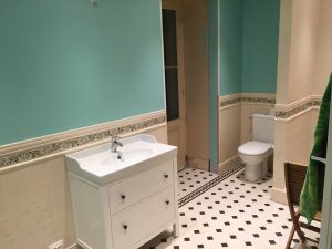 Målat andra lager i badrummet och satt dit handfatet. Tyvärr var inte Ikeas avloppsrör kompatibelt med Alberts avloppsrör. Måste köpa en liten ”adapter”.