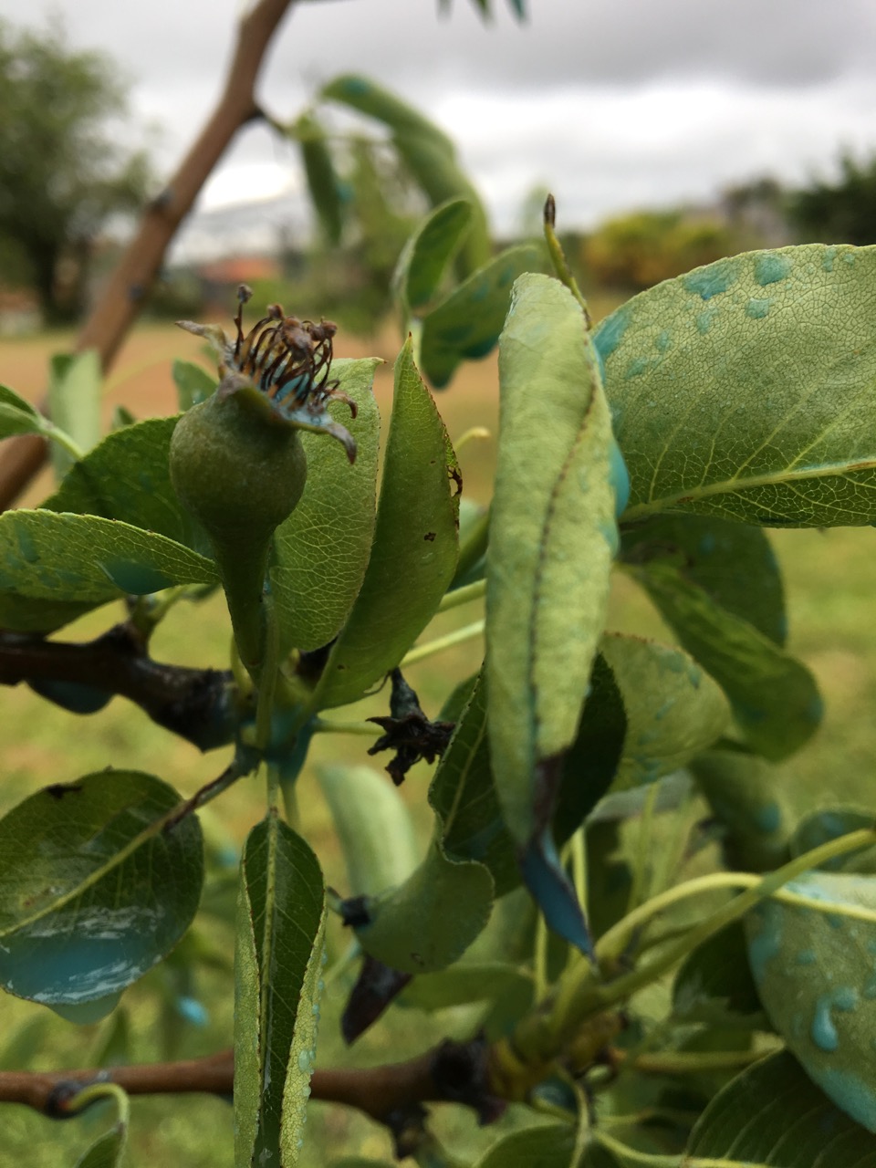 Vid halv fem ungefär blev det lite uppehåll så då fixade vi lite i trädgården. Jag besprutade fruktträd och vinrankor. Såg att det finns ett päron på det nysatta trädet.