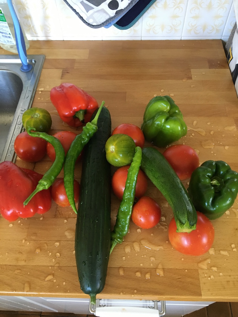 You are here: Home › 2018-06 › 21 juni 2018 21 juni 2018 Varmt och sol idag igen, men bara 32 grader som mest. Handlade lite på marknaden. Fixat dit tröskeln i badrummet och börjat sätta upp taklisterna. Grabbarna lagade gazpacho. Middag hemma.