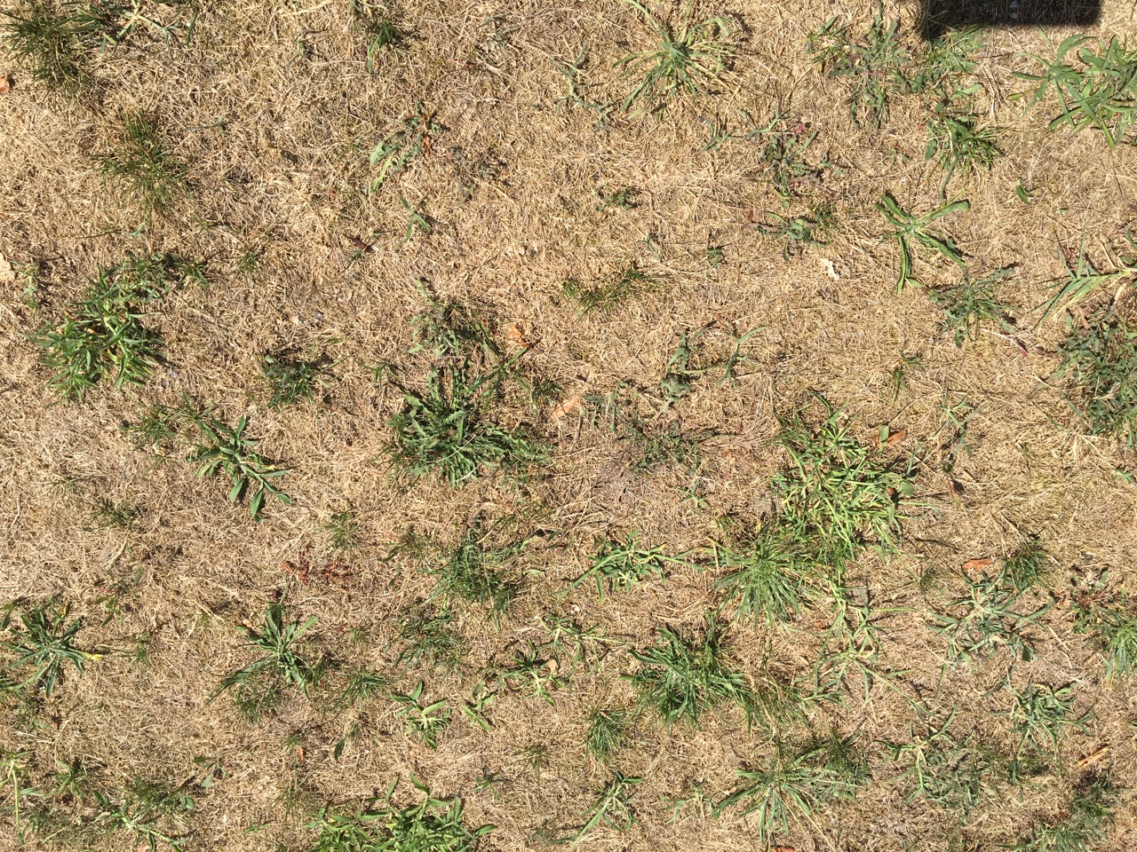 Och en bild på hur det nysådda gräset ser ut. Det bruna är det nysådda gräset som är stendött och det gröna ogräs som förstås klarar torkan bättre 🙁