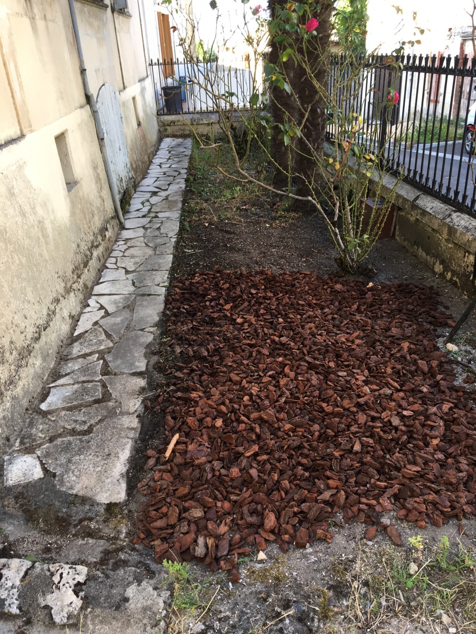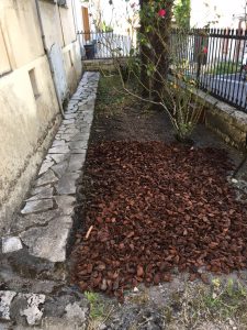 Rensat ogräs på framsidan och lagt på träbitar som skydd mot ogräs.