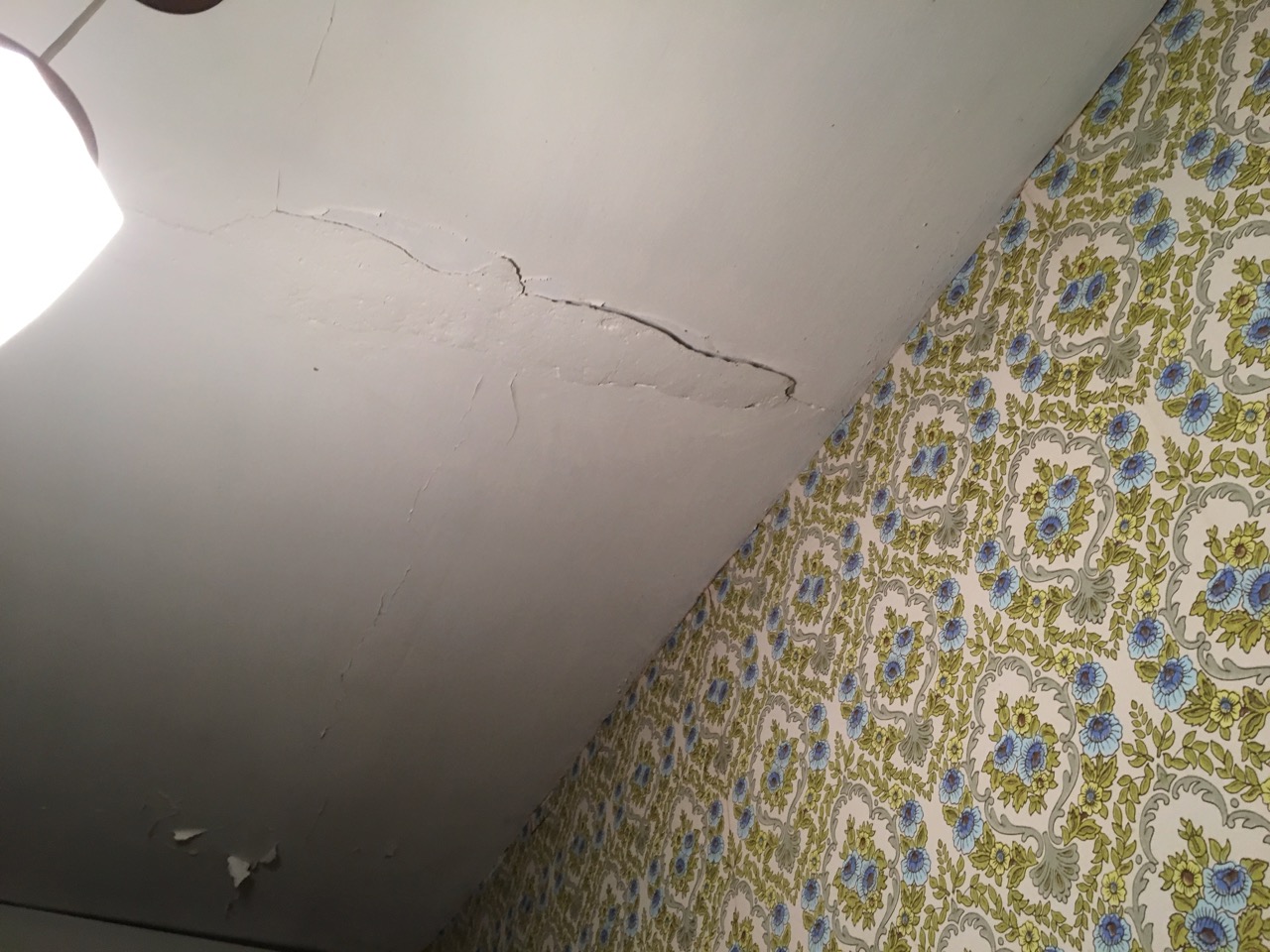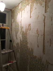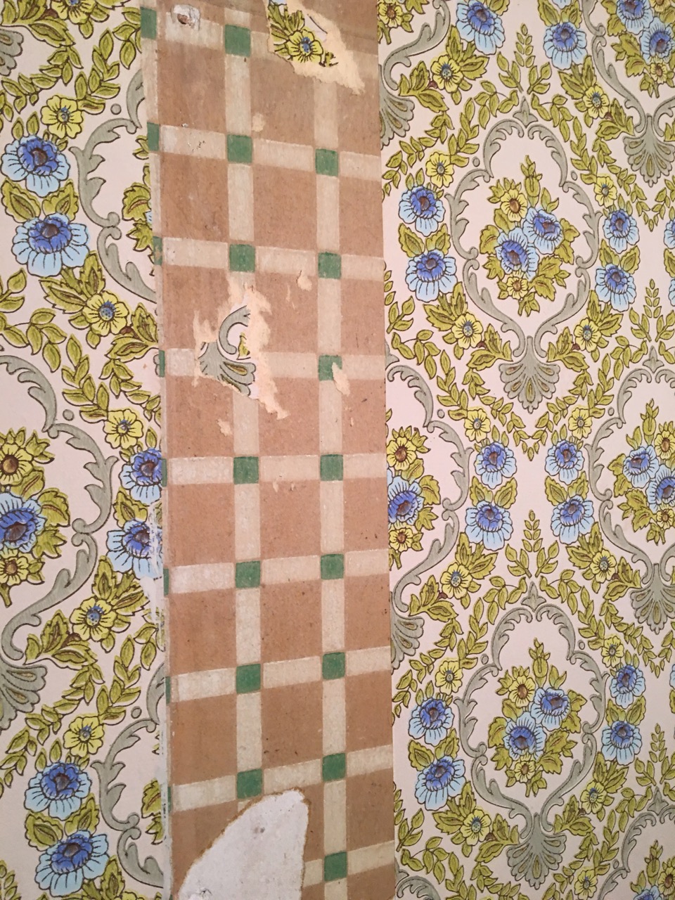 Jag började ta bort lösa tapetdelar från ena väggen i ”mellanrummet”. Fanns bl.a. en grön/vit rutig tapet inunder.