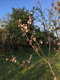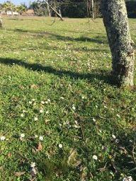 Aprikosen blommar igen och lite tusenskönor i gräsmattan.