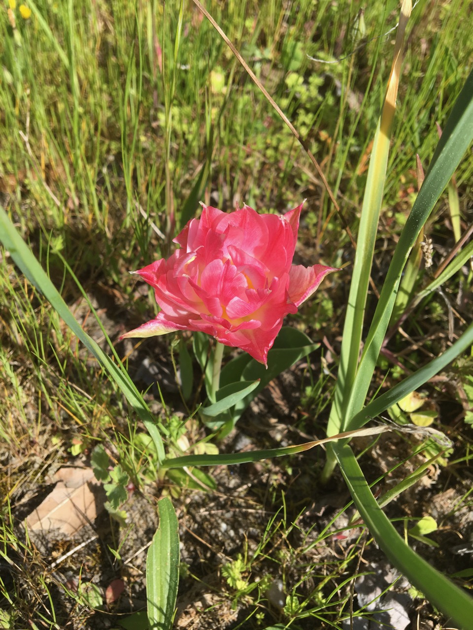 Fin ”flikig” tulpan alldeles ensam i rabatten.