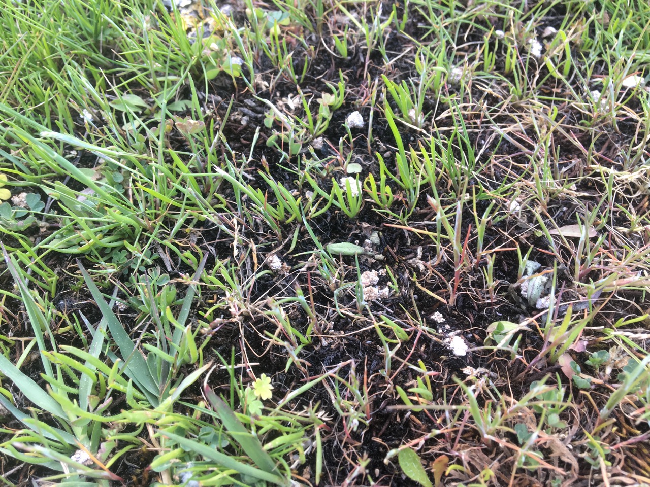 Detaljstudie av gödslad gräsmatta. Det svarta är förmodligen död mossa (anti-mossa ingick i gödslingen) och de gråvita kornen är gödsel. Och så fina ljusgröna, spirande grässtrån!