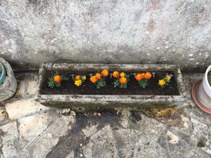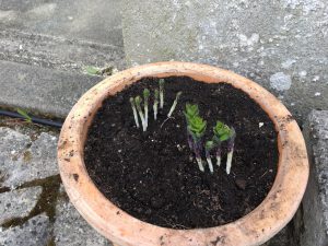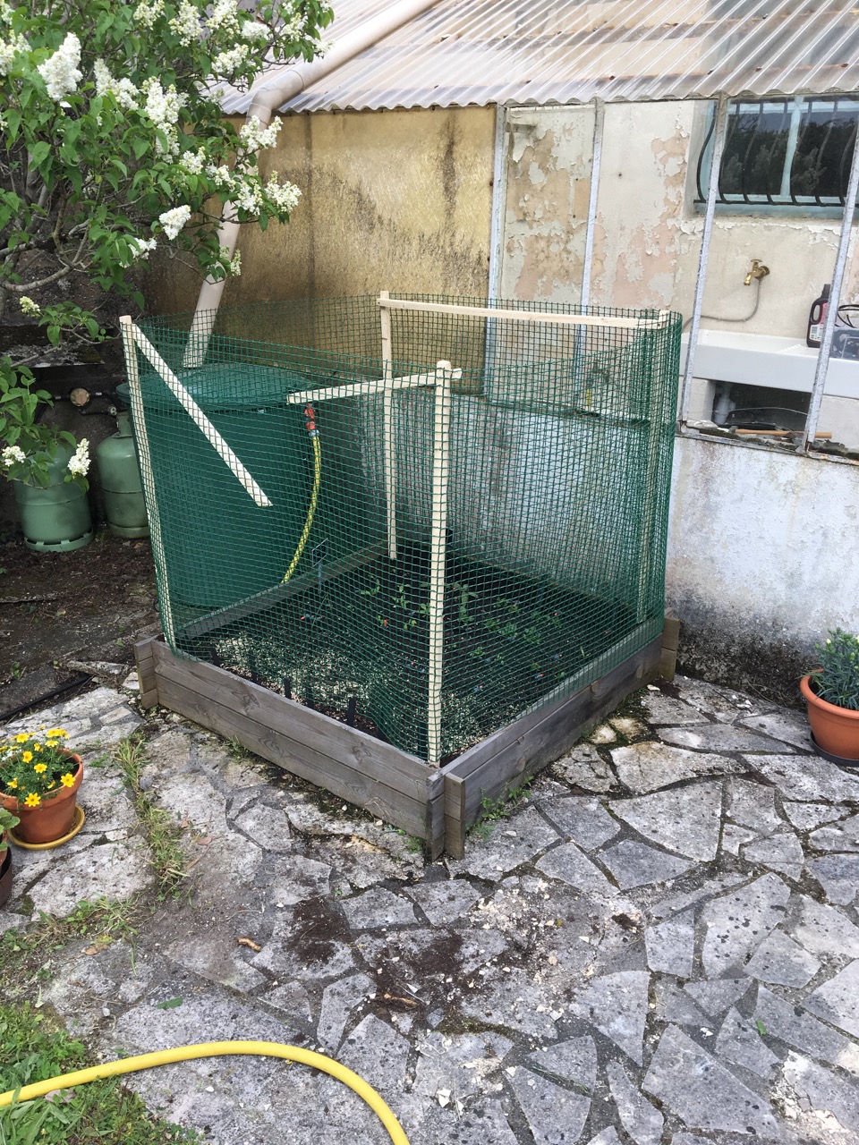 Jag försökte bygga en liten ”bur” runt odlingslådan för att hindra katterna att gå där och göra sin behov. Det gick väl sådär… Ska modifiera den i morgon.