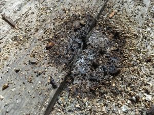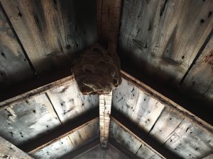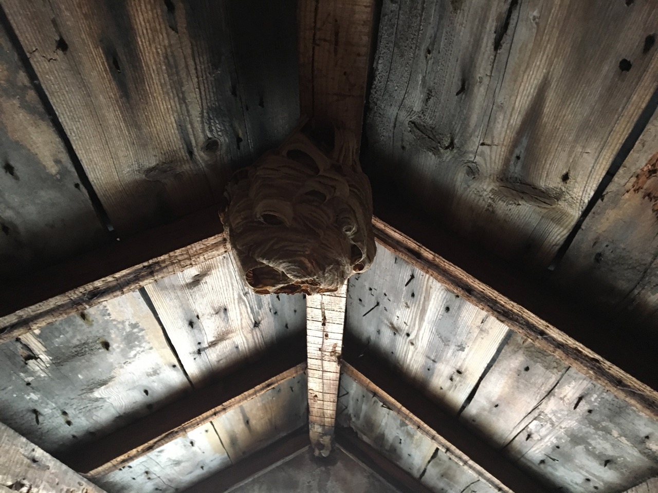 Hittade en getingbo på vinden. Verkade tomt och under det var en rätt stor fläck. Förmodligen har de dött av något konstigt. Låg döda larver och getingar också. Tog sedan bort resterna av boet.