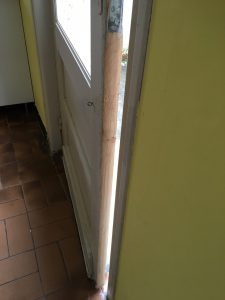 Innersta ytterdörren var inte helt stängd igår när vi kom för den hade svält. I november regnade det 240 mm vilket är väldigt mycket så fönsterluckor, fönster och dörrar har svällt. Jag fick hyvla av en hel del på dörren innan den gick att stänga igen.