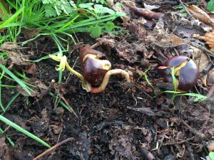 I trädgården växer nya småkastanjer upp.
