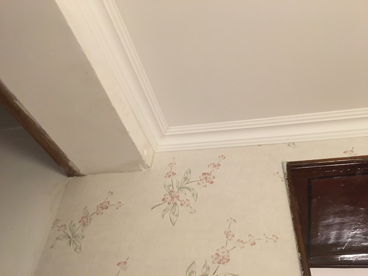 Köpt sista taklisterna till korridoren där uppe. Har målats, sågats till, satts upp och ”sikaflexats” en gång. Det är så snett i vissa hörn så det behövs en omgång till med ”sikaflex”.