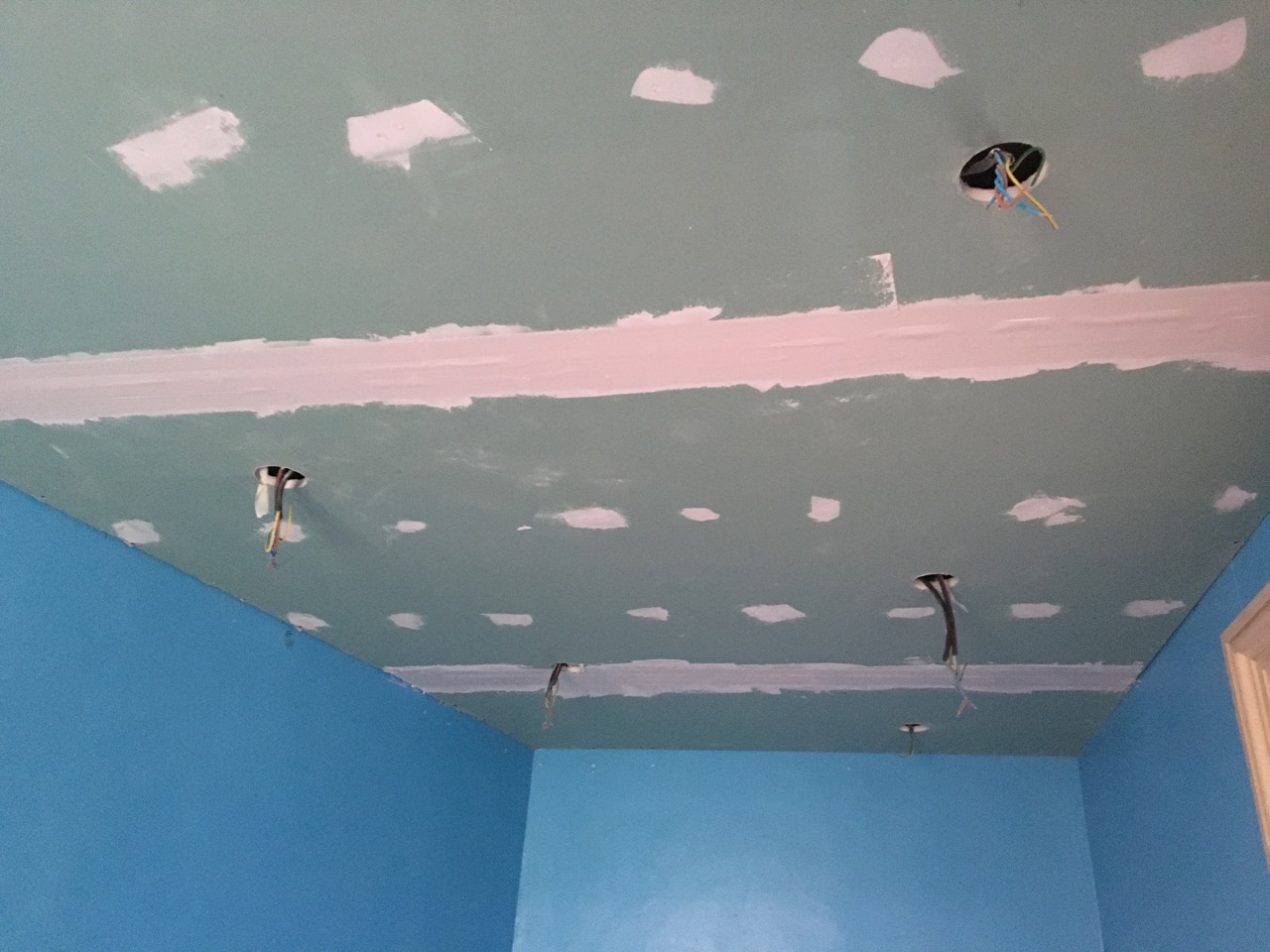 Spacklade taket i badrummet en första gång. (Det ser ut som rosa spackel med det är bara kameran i iPhone:n som spökar.)