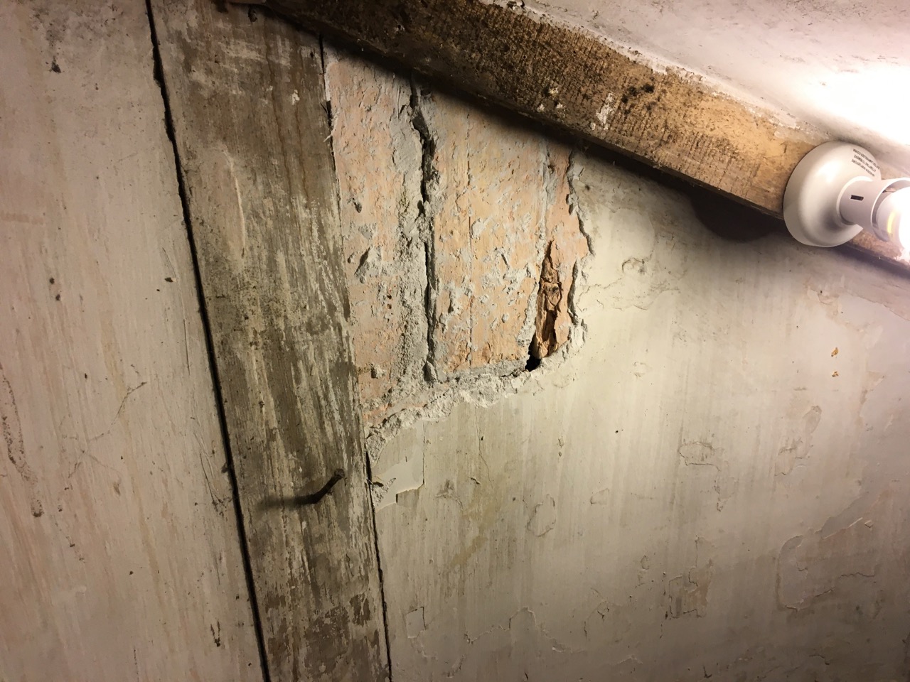 Men när det fortfarande idag lät bakom väggen knackade vi hål på väggen i delen av trappan som går ner till källaren. Här syns de två tegelstenarna som vi tänkte ta bort.