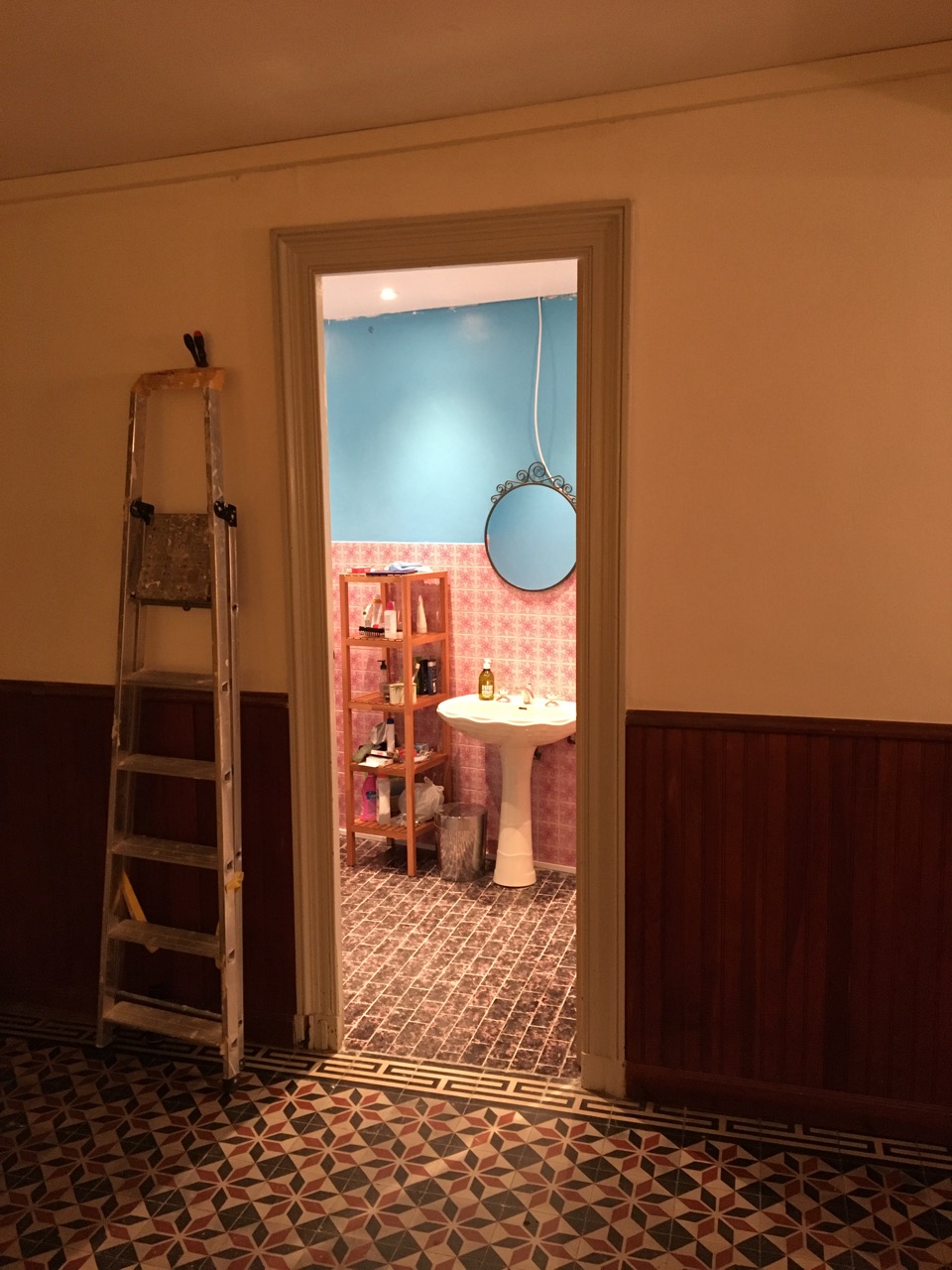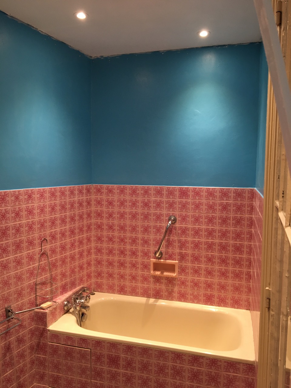 Sedan rensade L ogräs och jag målade taket i badrummet nere en sista gång och satte upp spotlightsen. Ser väldigt bra ut.
