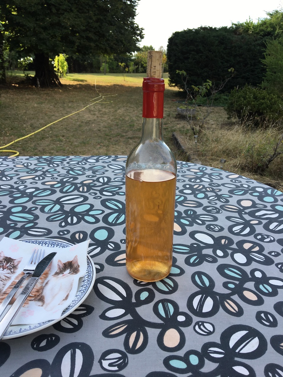 Fick en flaska aperitif från grannen vid gamla muren. Gjord på bl.a. persiko-blad som de plockat i vår trädgård. Mycket god, inte för söt.