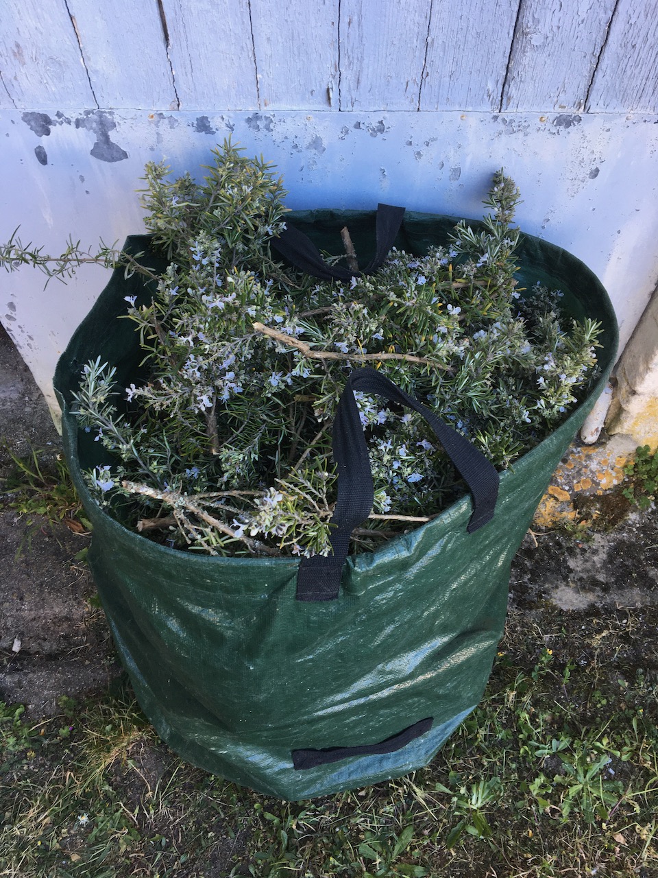 Klippte ner rosmarinbusken som växer så det knakar. En säck med rosmarinkvistar blev det.