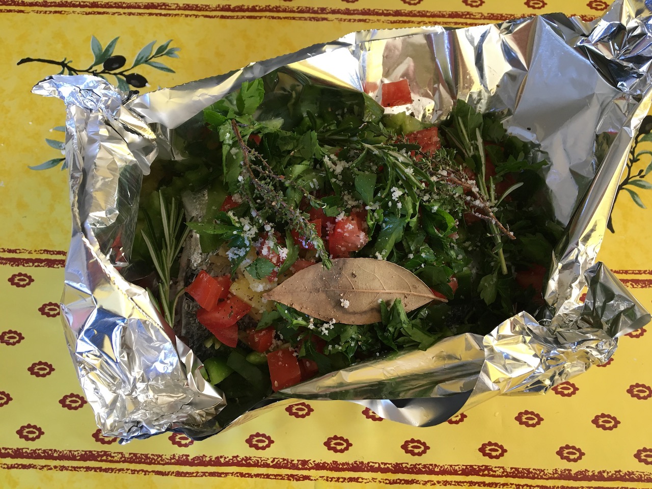 Bräserad guldsparid (dourade) i folie till middag.