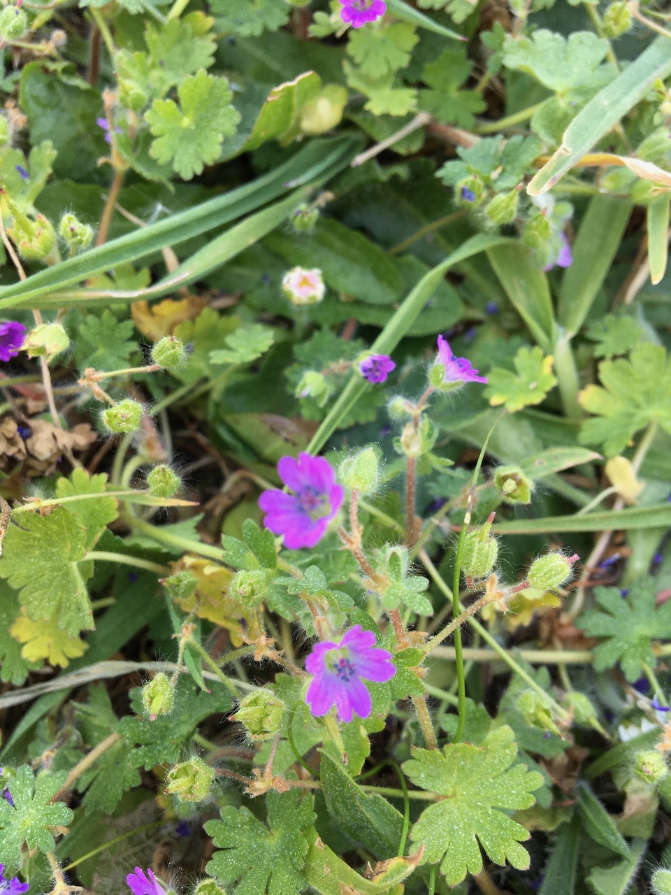Den växten som jag kallade ”fint blommande ogräs” den 4 april är Judaspenningar. Och i gräsmattan är det fullt med sparvnäva.