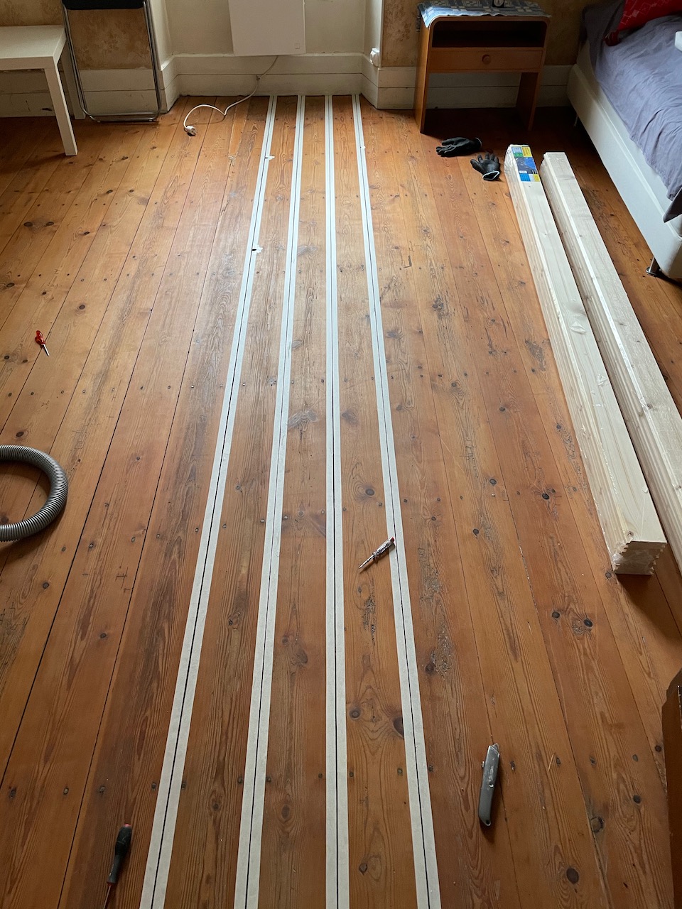 Efter det lite pyssel inomhus. Jag målar sockeln i trappen och förbereder nåtning i ett sovrum på bottenvåningen. L putsar fönster och tvättar fönsterluckor.