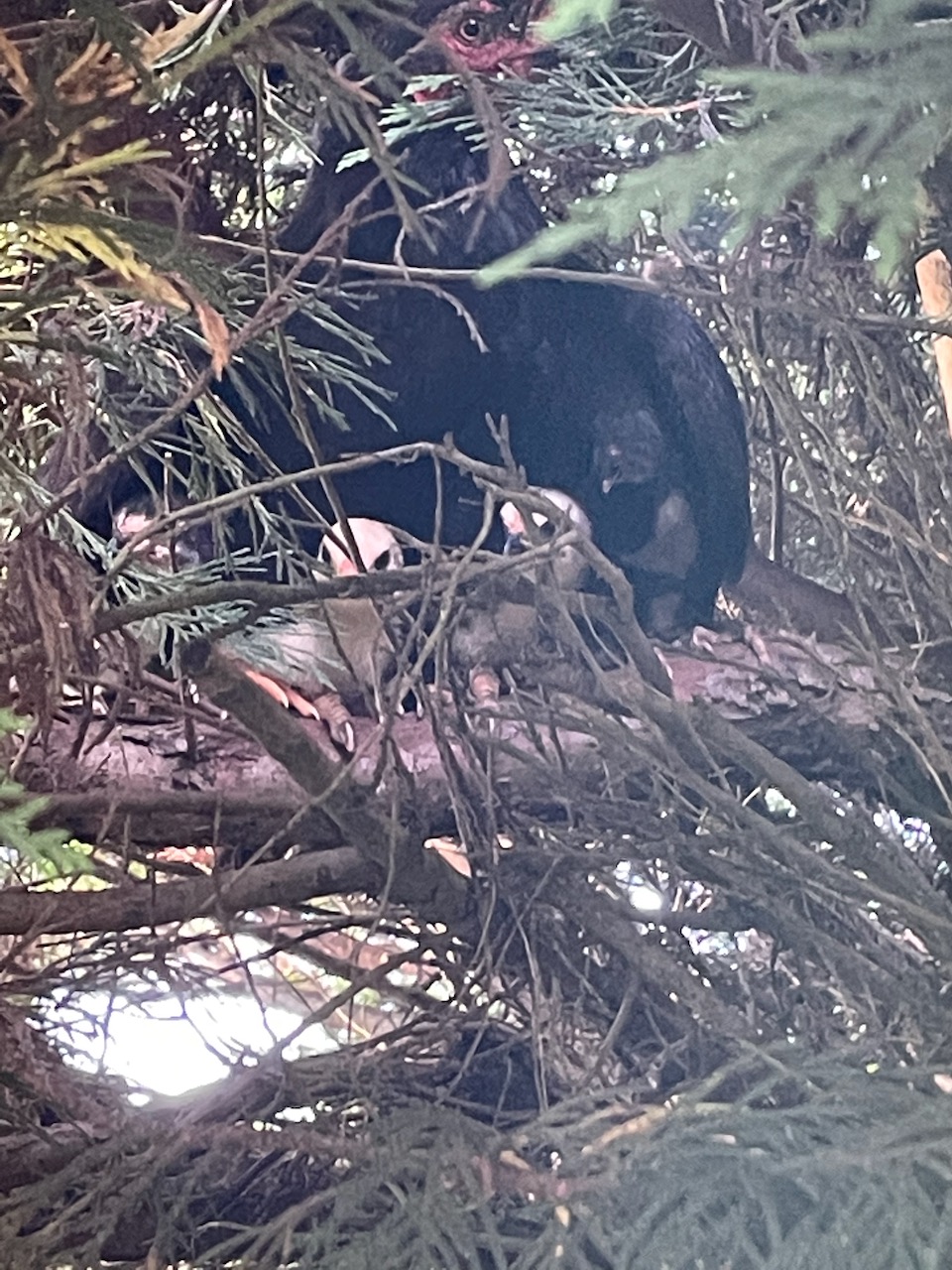 Hönsmamman med sina kycklingar när de satt sig till ro inför natten. De sitter på en gren i tujahäcken.