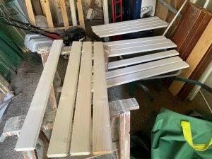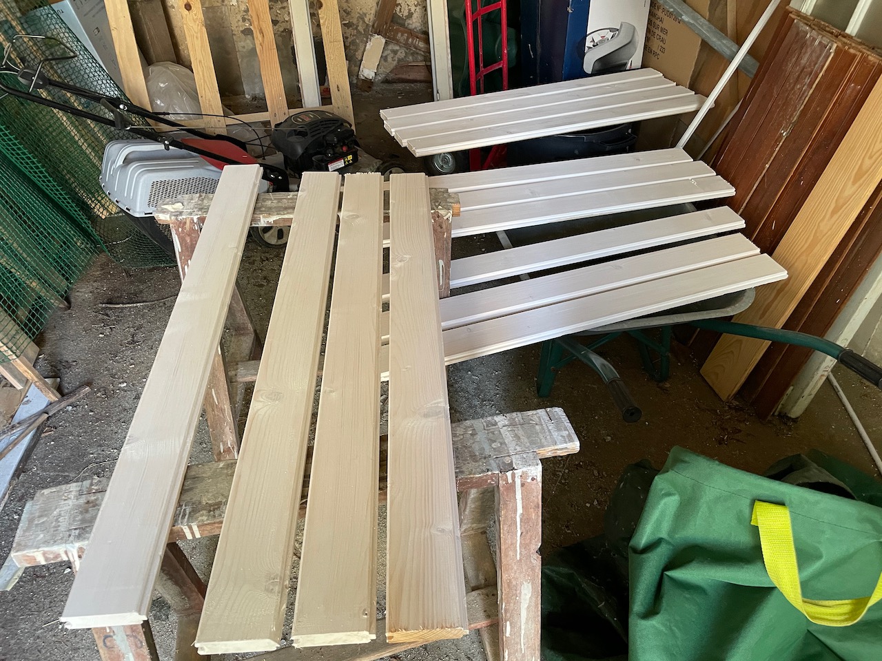 Jag började med källarlucke-projektet. Sågade itu plankor, behandlade dem mot trämask och börjat grundmåla dem.