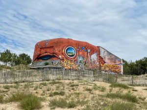 Tog en fika och glass lite längre bort, vid stranden. 20 grader i vattnet, 24 i luften. Inte så många människor på stranden. Någon har kört lite graffiti på en gammal bunker.