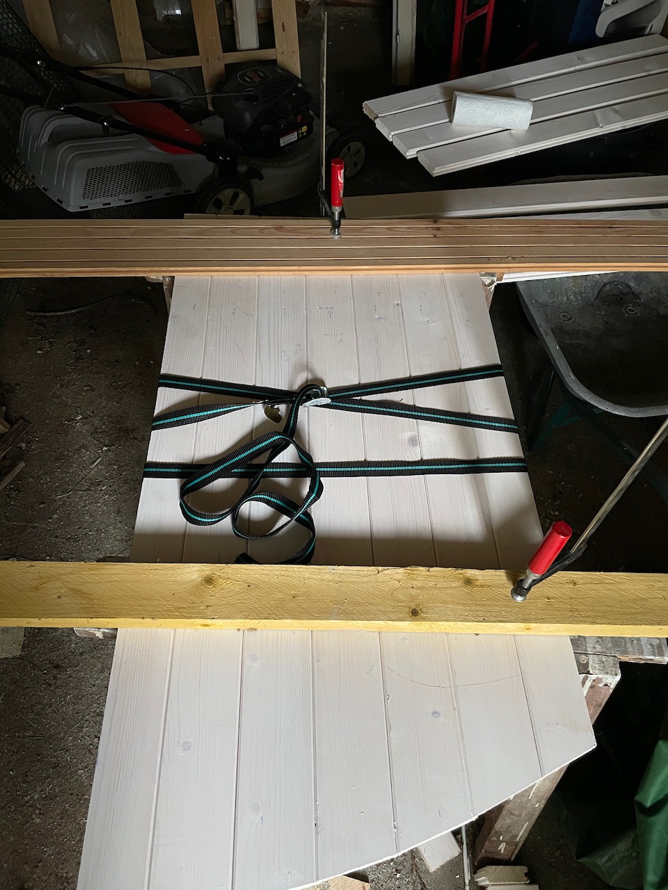 Fortsatt med källarluckan. Sågat till formen, grundmålat nysågade ytor och limmat ihop allt. För en luckhalva.