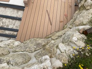 Poolgrannen håller på att restaurera sin pool och uteplats. Nu blir det trätrall i stället för sten. Trallen passas in med millimeter-precision mot stenarna. De lägger inte många plank per dag…