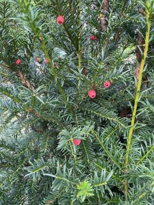 Ett litet barrträd som finns i rabatten har små rödrosa bär för första gången.