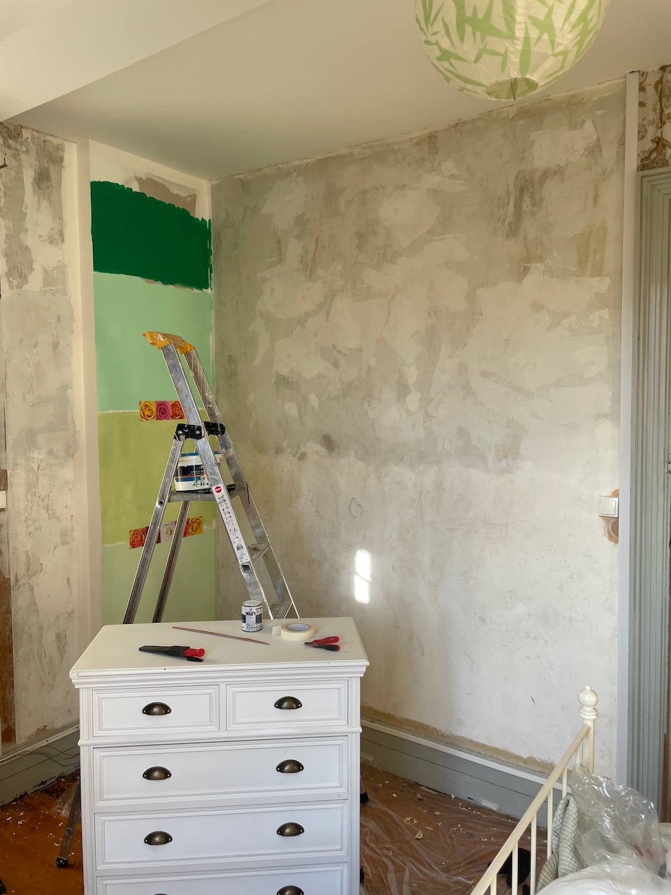 Började riva ner tapet i vårt sovrum. Har ju behövt fixas sedan kaminen installerades och väggen fick en ”utbyggnad”.