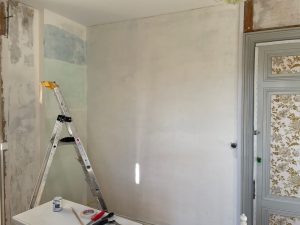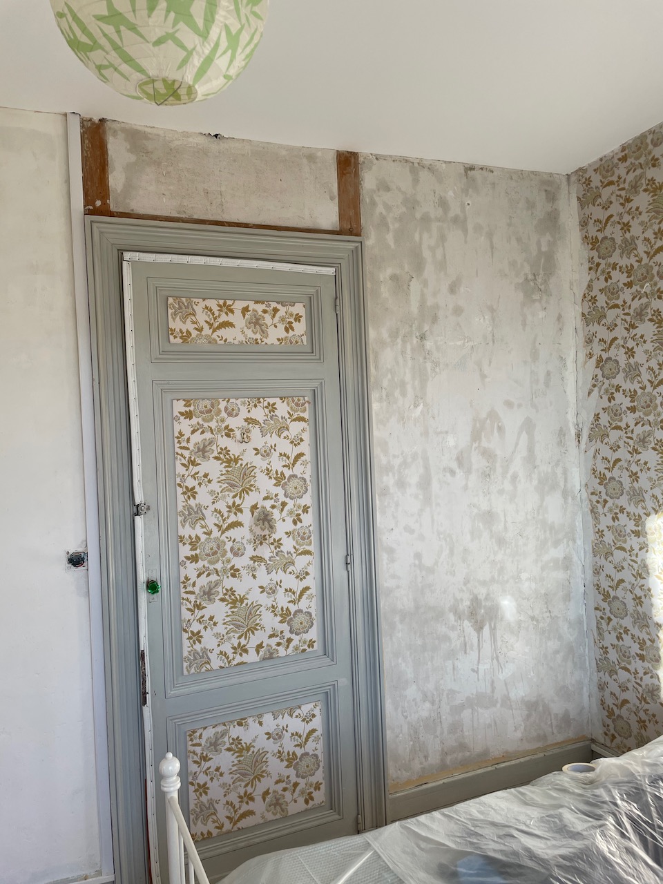 Grundmålade en del av väggen i sovrummet och tog bort tapet på resterande del av den väggen.