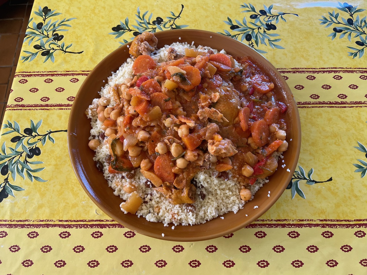 Grannfrugan tvärs över gatan, som är marockanska, kom förbi på förmiddagen och undrade om vi gillar couscous. Jag svarade ja och då gick hon och hämtade en laddning couscous-gryta med kyckling.