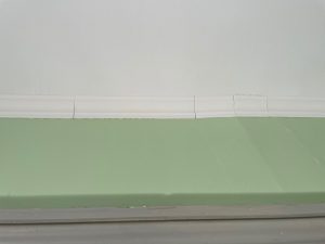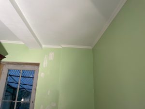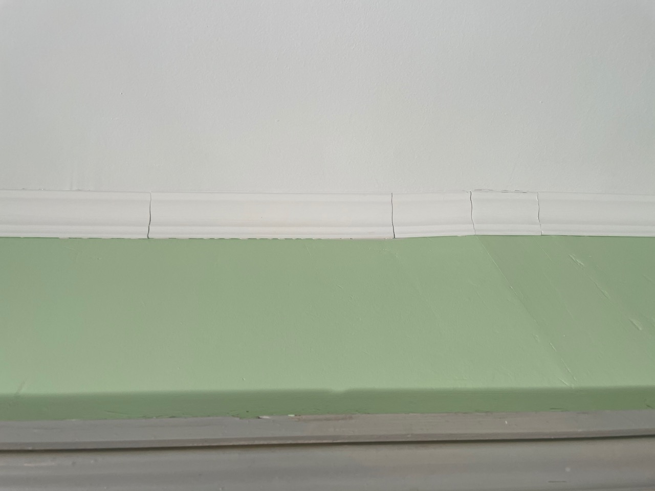 Väggarna är ju otroligt ojämna på sina ställen och eftersom taklisten limmas och inte spikas så blir jag tvungen att kapa listen på många ställen. Får fixa det med spackel sedan…