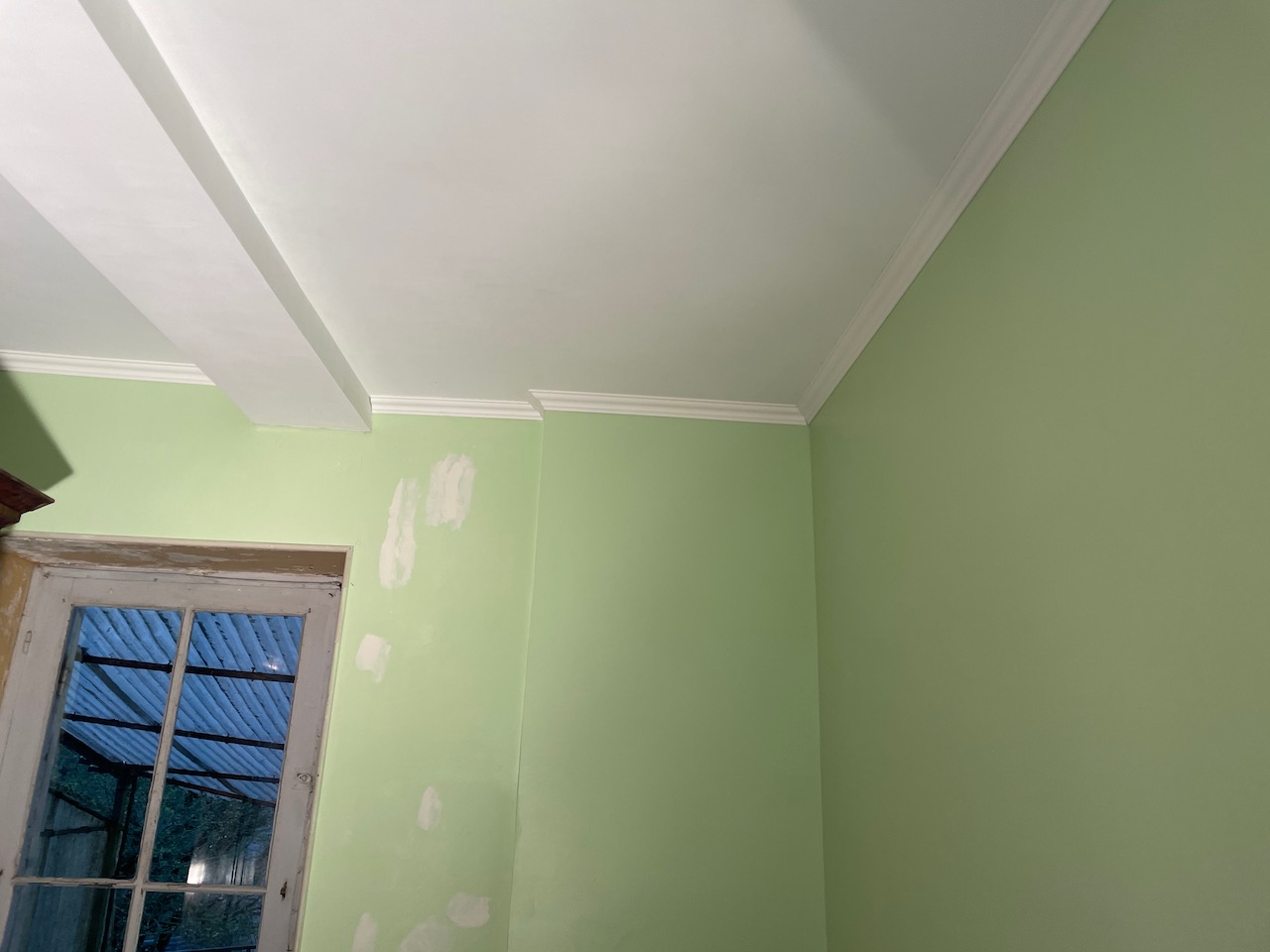 Jag fortsatte med sovrummet. Målat lite mer och satt upp taklisterna. Nu ska listerna spacklas och sedan måla lite på listerna och runt om där jag har kladdat ner.