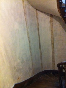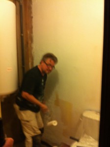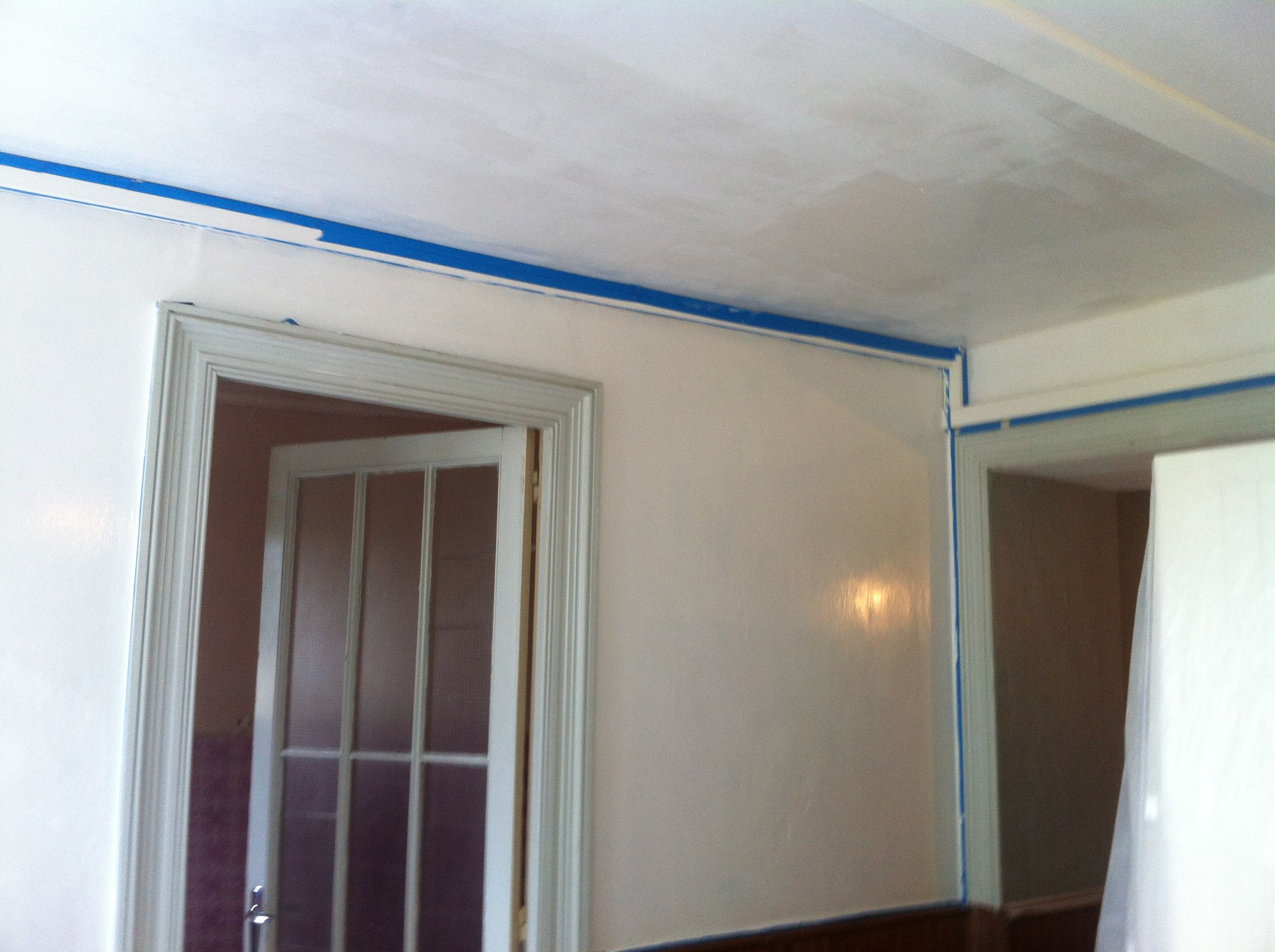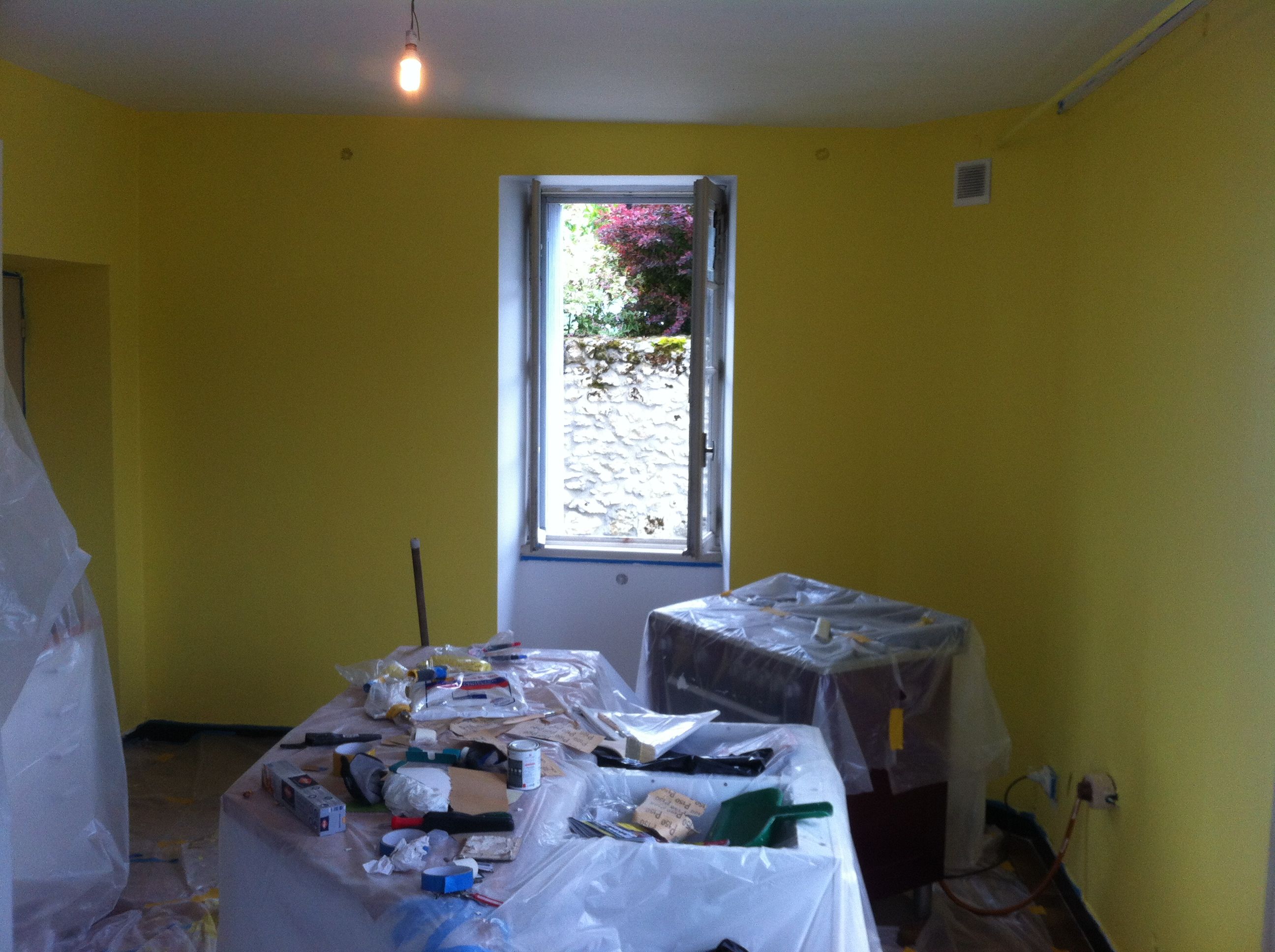 You are here: Home › 2012-05 › 19 maj 2012 19 maj 2012 Trappen med lite grundfärg. Samma strul där som i köket. Förmodligen målat med någon kritfärg som släpper när man spacklar eller målar med annan färg. Magnus målar toaletten. Gult kök. Och de struliga väggarna och taket i köket. Nu målat med oljefärg för att binda upp underlaget. Alla rosor.