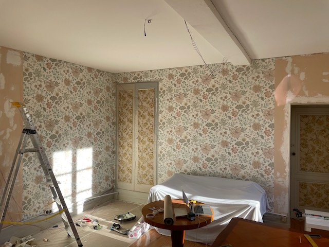 Jag har tapetserat ett antal våder i matrummet (våder på vänstra väggen i bilden). Först var det hörnet som ju alltid är knepigt, speciellt med skeva väggar, så det tog lite tid. Har även spacklat lite runt dörren ut till toa-hallen så där kan jag måla i morgon och när färgen torkat där kan jag tapetsera vidare på den väggen.