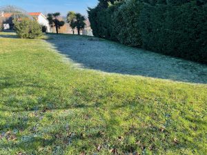 Fortsatt jobba med matrummet. En hel del slipande, spacklande och målande inför fortsatt tapetserande. Gick runt i trädgården en sväng och det är frostigt där. På valnötsträdet ser det ut som någon klippt bort alla skott, eller så är det något djur som käkat upp dem.