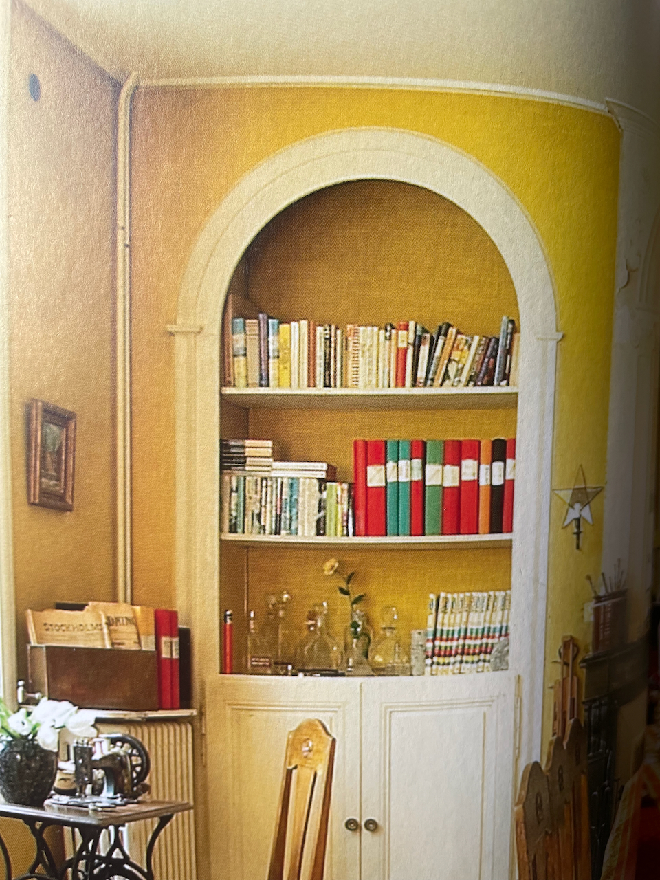 Sedan vill jag ju också göra om skåpet bredvid kaminen till en hylla (se exempel på bild nedan). Jag har ju till och med fått el indraget i skåpet för att eventuellt kunna ha en liten lampa där. Luckor nederst får bli ett senare projekt, men själva rundeln överst borde jag fixa nu innan tapetsering.