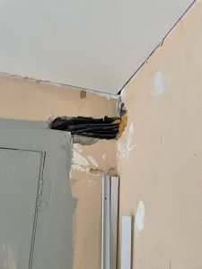 Fortsatte med att tapetsera i matrummet, väggen ut mot hallen. Passerade dörren där. Nästa blir hörnet. Där ska jag bygga en liten låda för att täcka elkablarna som går där. Skruvbart lock så man kan komma in där vid behov.