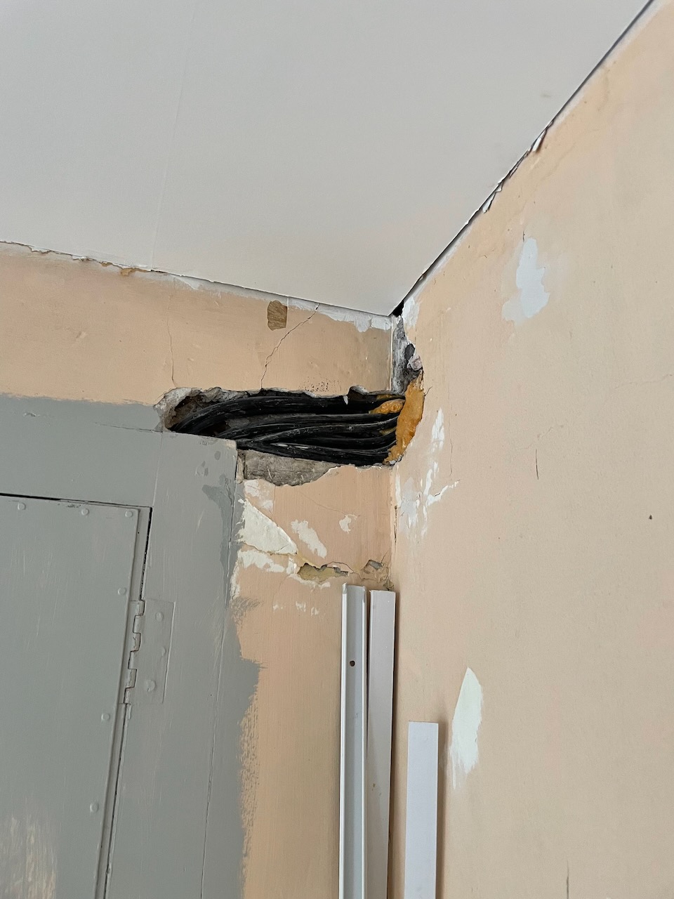 Man mäter, mäter igen och kollar allt tycker man, men ändå slutar det så här ibland. Väldigt sällan som tur är. Och det här är ju nere vid golvet och bakom dörren så ingen kommer väl se en liten skarvbit där.