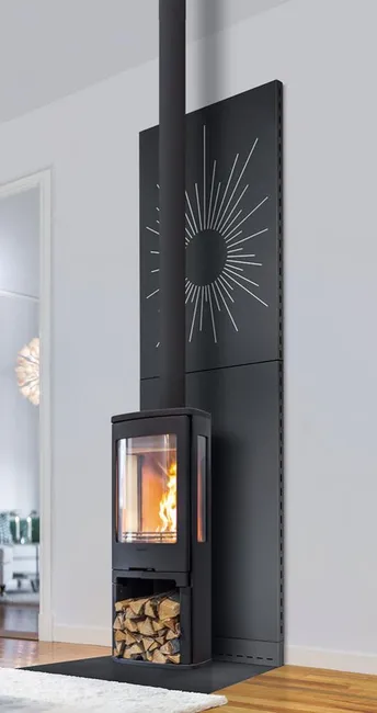Problemet är bara att hitta någon som kan/vill sätta dit den. Som den här ungefär men utan solen ovanför förstås. Och mitt skorstensuttag går horisontellt inåt och in i väggen. Inte som här, vertikalt uppåt till taket.