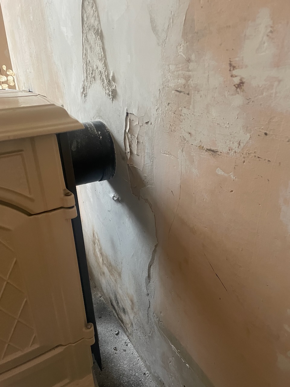 Så kaminen måste dras ut och plattan träs över skorstensuttaget. Tror det behövs en behörig för det. Så att det blir tätt igen.
