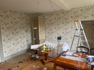 Fortsatt med matrummet. En del tapetserande men behöver måla mer. Med oljebaserad färg som tar tid att torka. Fixade klart elen på väggen ut mot toan. Började också med lite list-fixande i nya hyllan. Totalt kaos i matrummet.