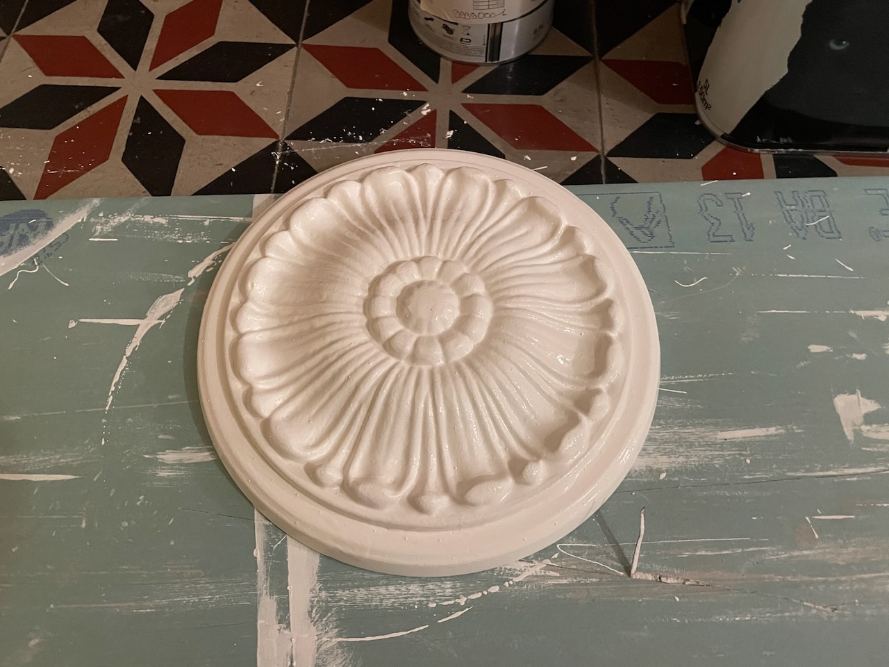 Målat lite här och där. Ska sätta upp en tak-rosett i sovrummet så den grundmålades.