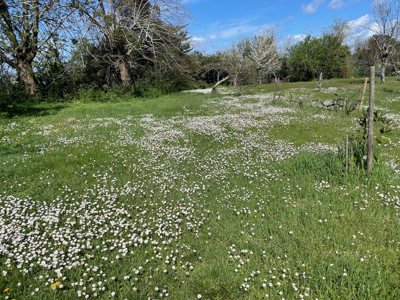 Massor med margeriter (?) i gräsmattan.