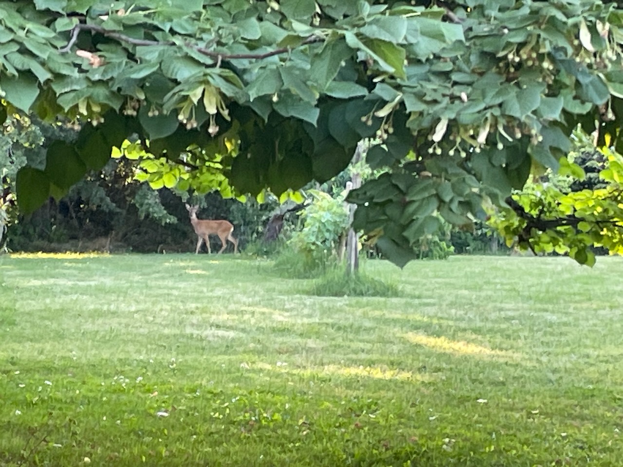Medan jag satt och åt kom en hjort (?) in i trädgården och hälsade på. Verkar äta på linden. Kom tillbaka lite senare igen.