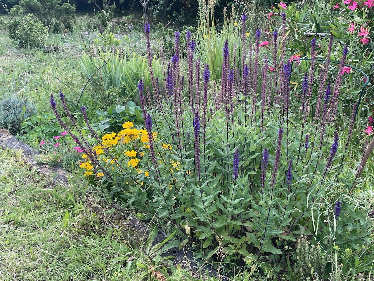 Stäppsalvian är fin bredvid Flickögat och små nejlikor i bakgrunden.