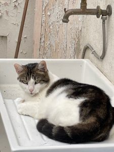 Igår kom en coolare katt. De flesta katter är livrädda och springer som galningar när de ser mig, men den här var helt lugn. Gillade att ligga på vasken.