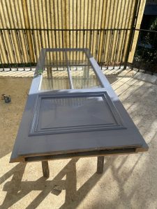Och dörren ska kapas nederst för att passa med tröskelns höjd. Så jag tog loss dörren och kapade den och passar på att måla utsidan nu när man ändå har den nere.